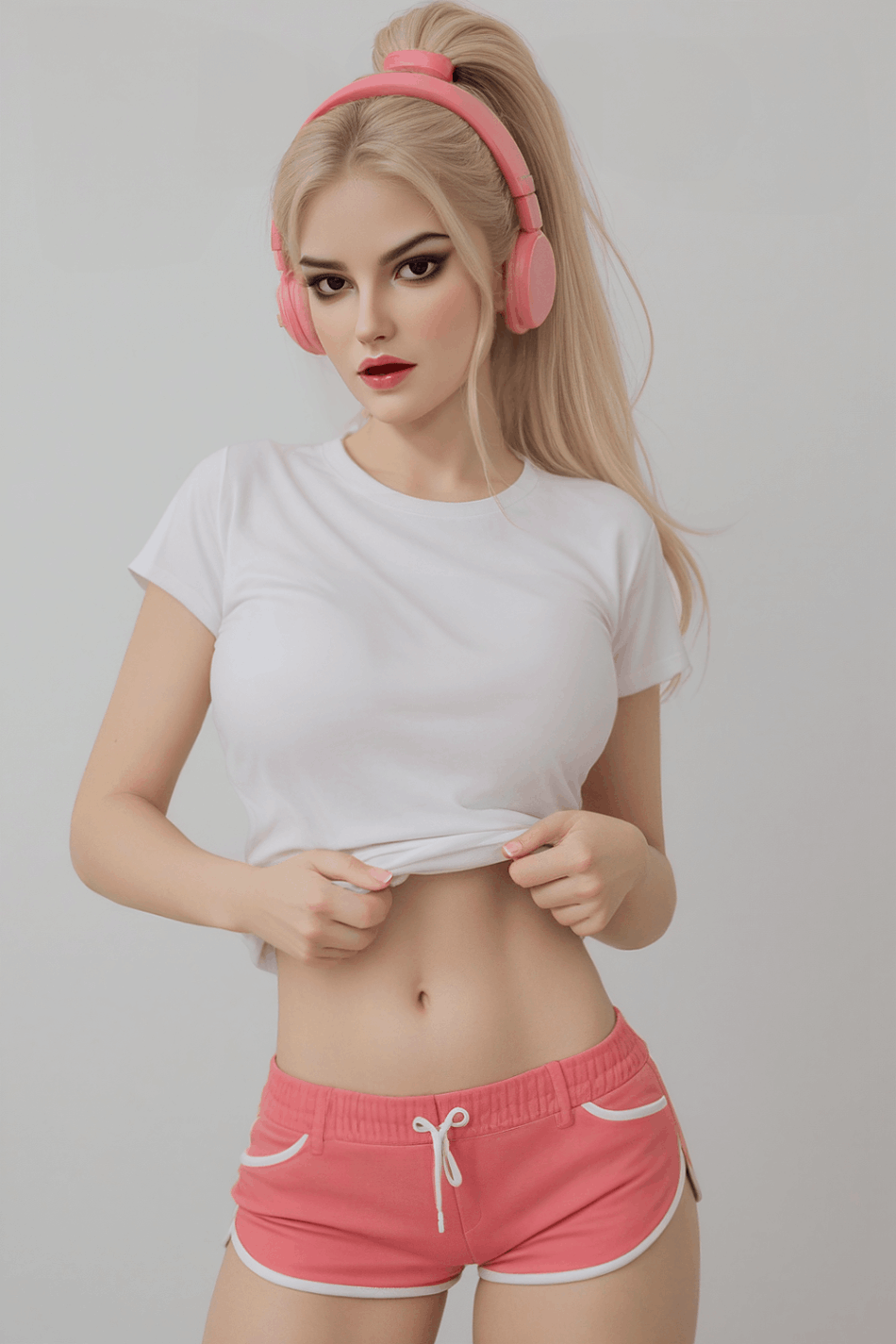For the default version, she comes exactly as pictured with the wig, standard skeleton, built-in vagina, and standing feet.
